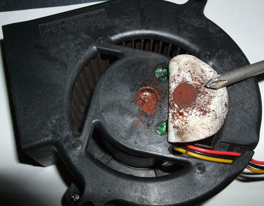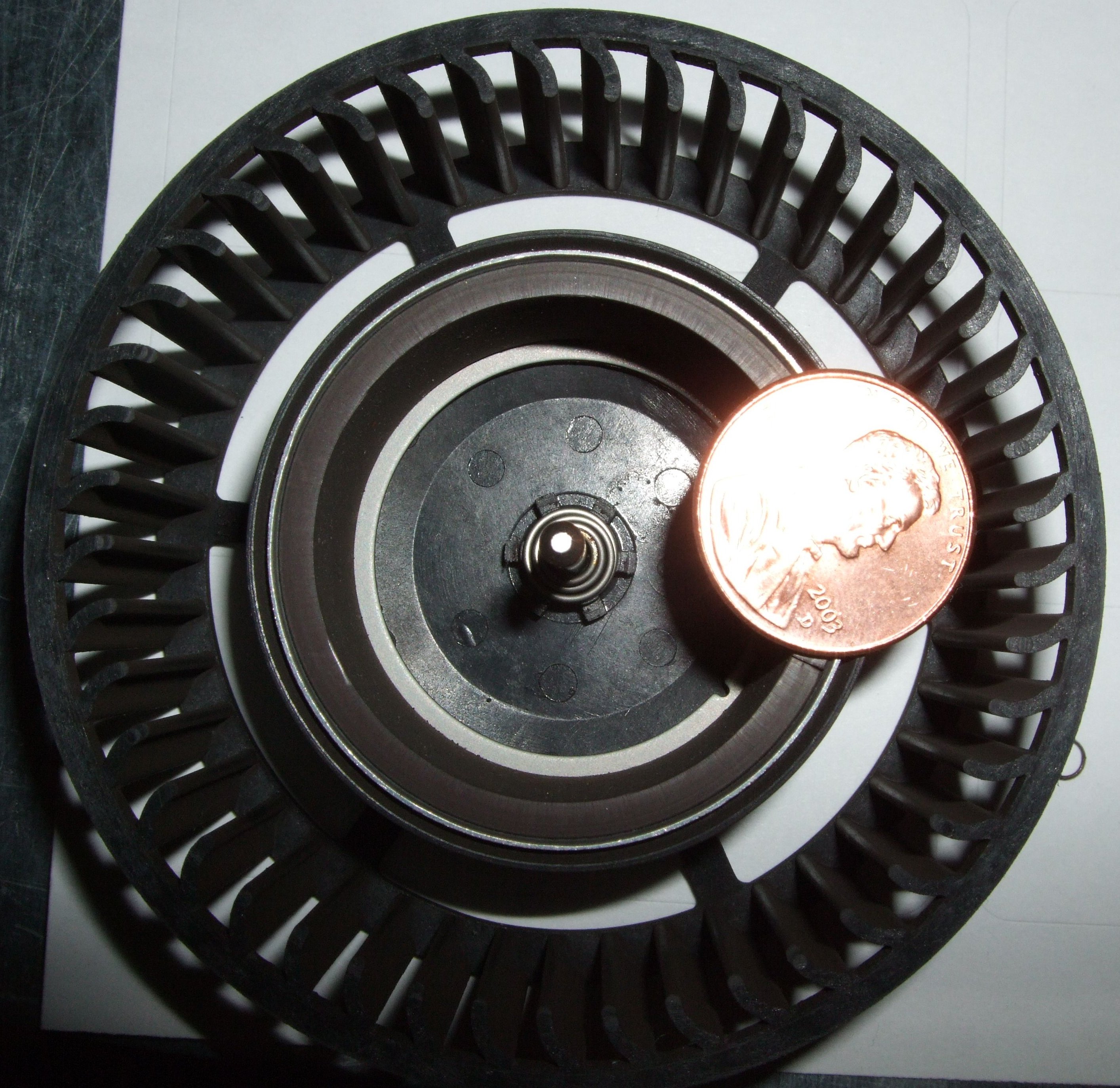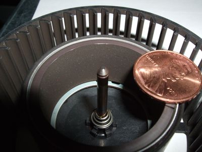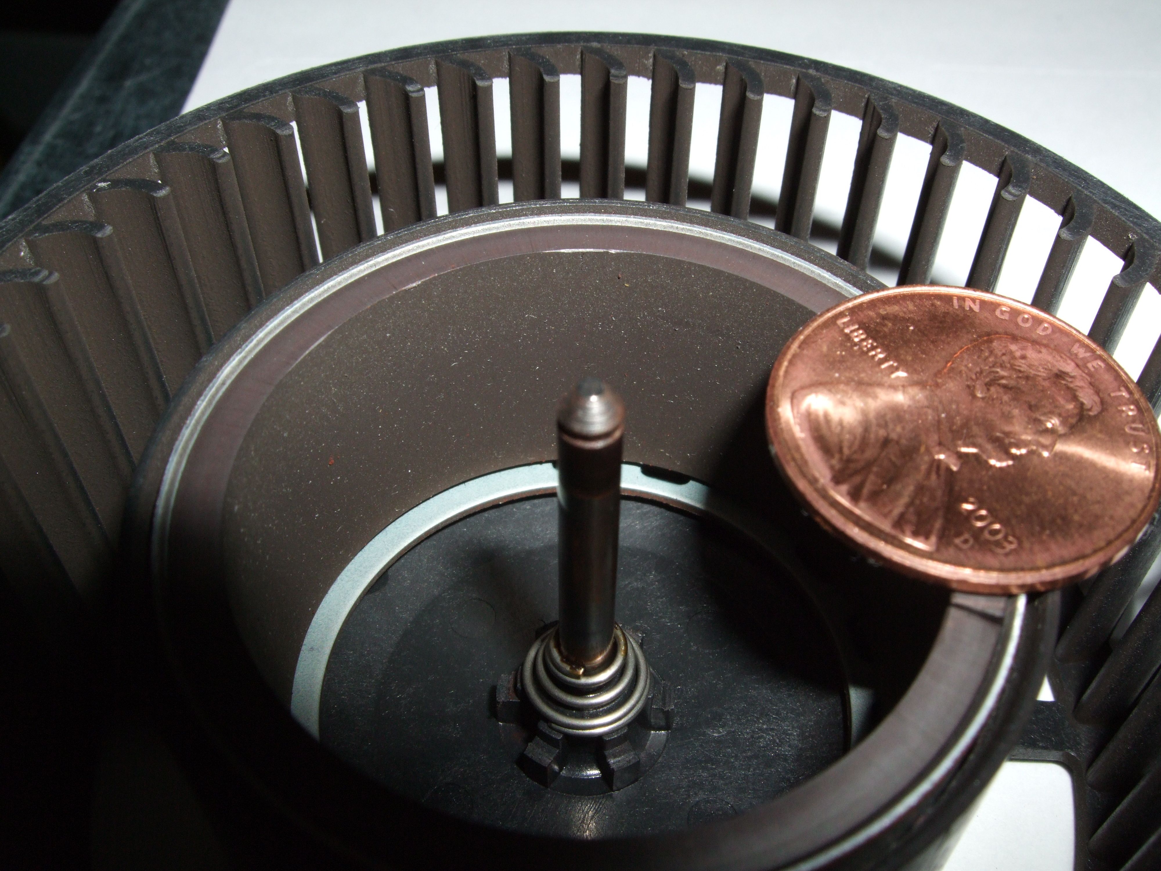 In the above pictures you can see on the cage side of the shaft there is a small spring to keep the cage off of the motor. With a retaining ring in place, that spring would keep the cage/shaft/ring pressed up against the bearing, and centered in the housing. So when the ring wears out and pops off, the cage moves slightly away from the intake side of the housing and starts rubbing on the other side of the housing. Now fortunately, due to the magnet in the cage being attracted to the motor, it wants to stay pretty close to where it should be, but it's still enough to make a huge amount of noice, slow the fan down, and probably eventually cause the fan to lock up.